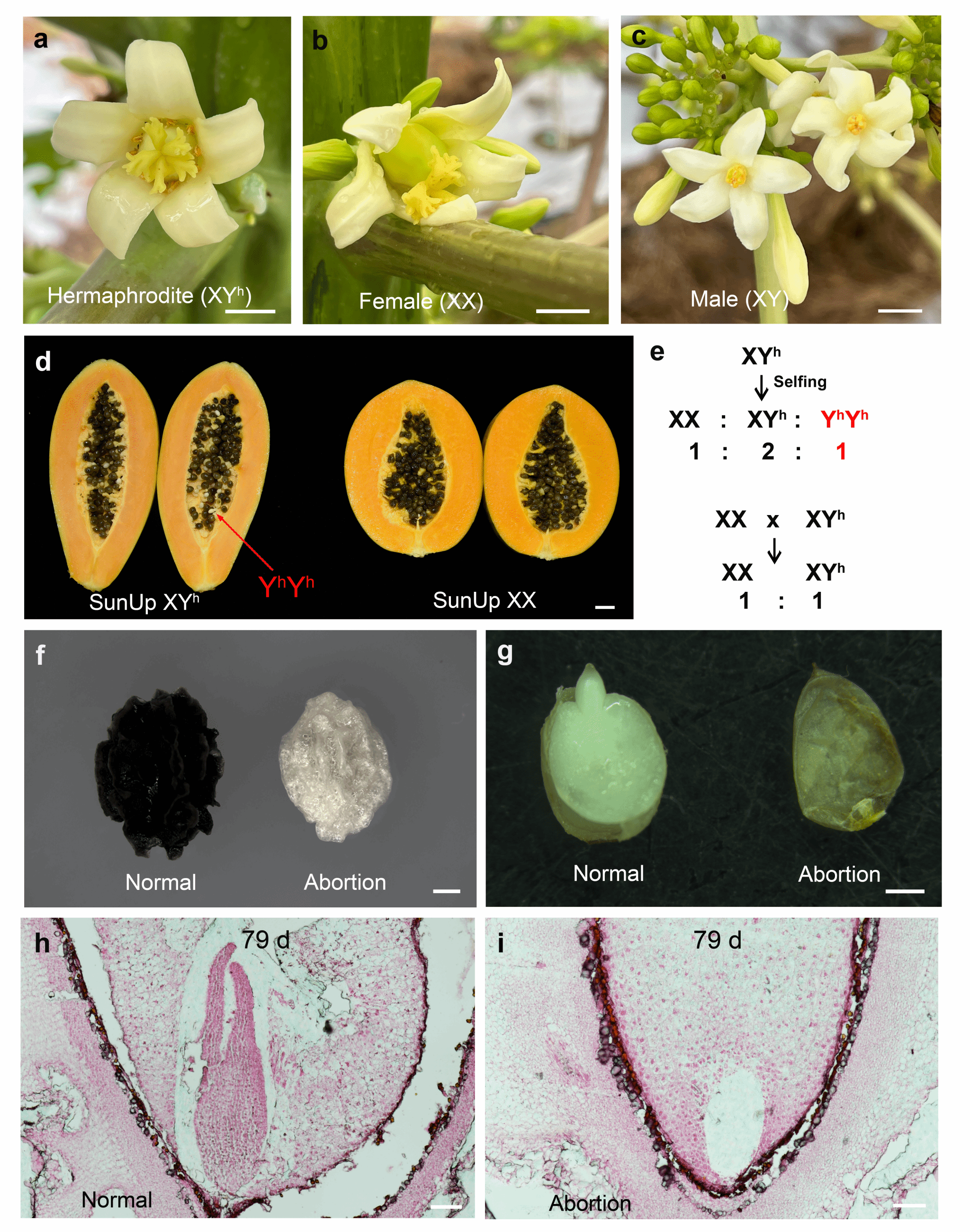 番木瓜是一种重要的热带经济水果作物,其植株性别类型多样,包括雌株(XX)、雄株(XY)和雌雄同花植株(XYh),是被子植物中罕见具有三种性别类型的物种,因而成为研究作物性别演化与决定的理想模式体系。番木瓜性染色体处于演化过程的第三时期,YY基因型败育是该阶段的标志性特征。这一败育机制有效避免了超雄性 YY 个体的产生,从而防止其后代全部变为雄性的潜在演化风险。在雌雄同花植株自交后代中,约25%具有YhYh基因型的种子会因胚致死而无法发育,从而导致后代中雌株与雌雄同花植株的比例约为1:2。尽管这一现象早在70多年前就被发现,但YY、YYh和YhYh基因型胚胎败育的具体分子机制至今仍不清楚。