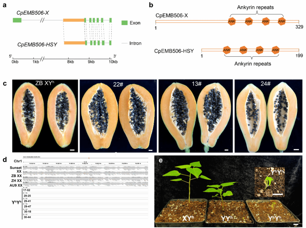 该团队通过对番木瓜性别遗传模式的系统观察发现,两性株自交后代中约有25%的白色败育种子,这些种子对应的是纯合YhYh基因型,其胚胎在发育后期(授粉约50天后)发生败育。通过推测致死基因在X染色体上保持功能而在Y染色体上功能丧失,研究团队对X特异基因进行了系统筛选,发现一个编码锚蛋白重复结构域蛋白的基因 CpEMB506。该基因在早期胚胎中高表达,其在拟南芥中的同源基因是胚胎发育所必需的。该基因在X染色体上具有完整的结构与表达活性,而在Y染色体上,由于第一外显子及大部分第一内含子的缺失,该基因已丧失功能,成为一个不表达的假基因。这使其成为导致YY、YYh、YhYh败育的首要候选基因。