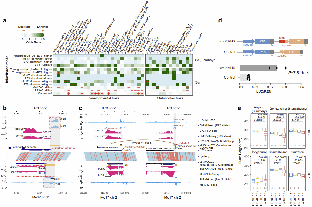 进一步针对筛选出的非加性染色质开放区域关键调控元件,开展了靶向功能验证实验。结果表明,关键基因salmon silks2(sm2,鼠李糖基转移酶)上游的超显性上调开放区域可作为远程增强子,能够有效激活sm2基因的转录表达,显著提升该基因的表达水平。进一步的表型分析显示,sm2基因在杂交种背景下的过表达,相较于正常杂交种表现出明显的表型优势,具体体现为株高显著提升、节间长增加、节数增多,这些表型均与玉米杂种优势密切相关。通过上述功能验证,研究首次构建起染色质开放促进杂种优势表型的完整实证链,明确了该调控通路在玉米杂种优势表型形成中的重要作用。