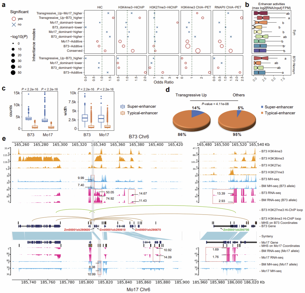 在占比仅3.5%的非加性遗传染色质开放区域中,超显性上调(显著高于双亲)开放区域被证实是调控玉米杂种优势的潜在关键元件。该类区域具有三个显著特征:一是进化上高度保守,受纯化选择压力作用,在玉米基因组中属于功能核心区域;二是具备更强的活性表观修饰强度及增强子活性,空间上可富集形成CRE簇(植物类超级增强子),可利于主导远程染色质互作,能够协同调控基因表达;三是功能上更倾向于富集与杂种优势相关性状的调控位点,包括与产量(穗粗、节间长)、抗病性及关键代谢通路(淀粉、氨基酸合成)的表型变异高度关联,潜在参与了杂种优势的形成过程。