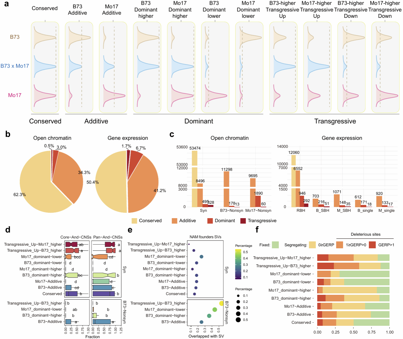 结果表明,玉米亲本之间表现出广泛的开放染色质差异,约81%的区域具备序列共线性,其中20%因核心基序分化而表现出亲本特异性。进一步探究杂交过程中染色质开放性的遗传模式,以保守型(62.3%)和加性(34.3%)为主,非加性遗传仅占3.5%,开放状态明显区别于双亲。杂交种中的染色质开放性呈现出一种普遍增强的趋势,并新增了数千个亲本中未发现的开放位点。进一步对比分析发现,染色质层面的遗传稳定性相较于基因表达层面更高,提示染色质开放状态可能是调控玉米杂种优势更稳定的上游环节。